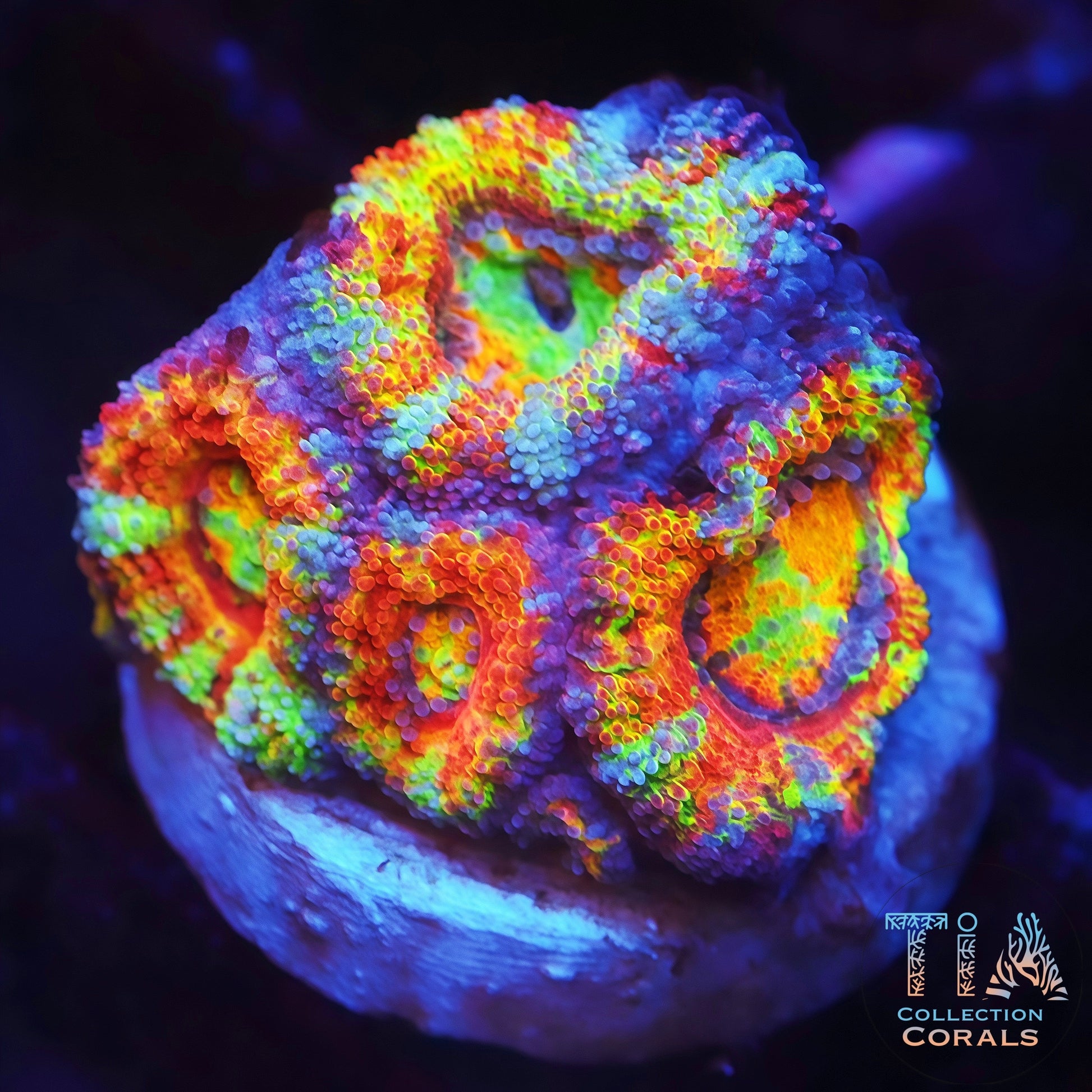 Photos taken under Actinic Radion Mobius (100% UV, 100% Violet, 100% Royal, 20% Blue) using Canon 90D + EF-S 60mm f/2.8 Macro. Color may vary under different lighting. Photo labeled with ÒStock ImageÓ ribbon shown for reference Ñ actual frag will be similar in color and size.