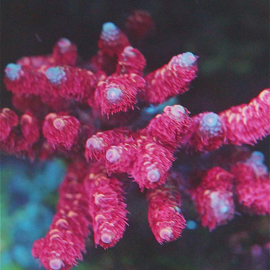 TIA Ruby Red Millepora shows a deep ruby-red base with bright glowing polyps that give the colony a soft, fuzzy appearance under actinic lighting. The contrast between the rich red branches and the lighter polyp tips creates a warm, fiery look that stands out in any SPS collection. Milleporas are known for their movement and texture, and this piece displays excellent polyp extension with strong, healthy growth. The coloration stays intense under proper lighting, making it a great choice for reefers who enjoy bold, warm-tone Acropora.