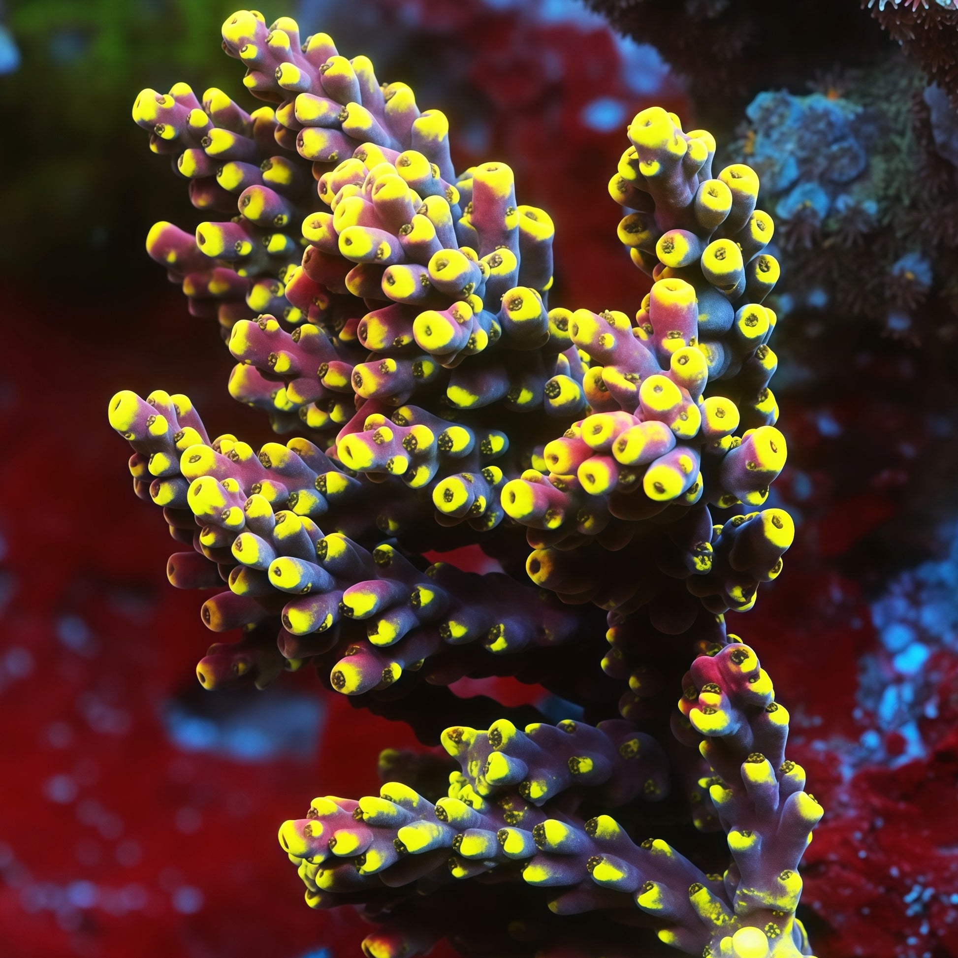 类型:鹿角珊瑚颜色:丰富的李子紫色身体,带有鲜艳的黄色息肉中心和微妙的粉红色至淡紫色点缀