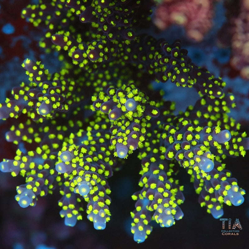 颜色:浓郁的紫色基底,带有强烈的霓虹绿色息肉和闪亮的冰蓝色尖端